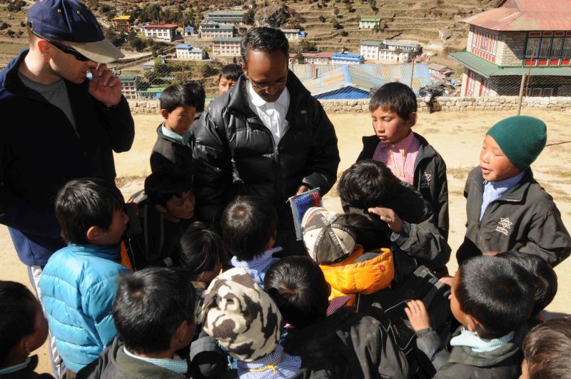 Only the so called mountain expert with the Finnish hat has to improve his knowledge about difficult climbing routes in the Himalaya.